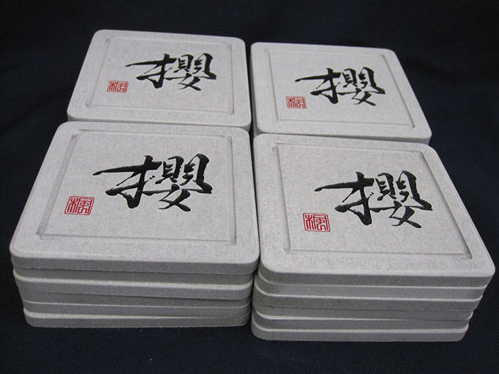 サンドブラストという技法で、ガラスや陶器にイラストやロゴを彫っています。